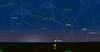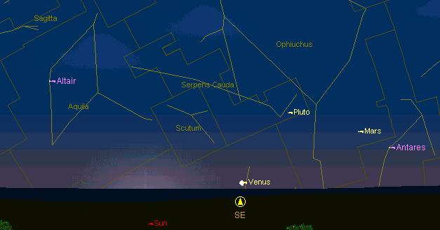 Первое такое соединение в 2005 году состоится 14 января в 5 часов 29 минут по московскому времени. Произойдет соединение Венеры и Меркурия. Планеты сблизятся на 0,35 градуса в созвездии Стрельца на расстоянии 19 градусов от Солнца. Расстояние между планетами будет чуть больше половины диаметра Луны. Такие сближения случаются достаточно редко. В России сближение этих планет можно будет наблюдать 12, 13 и 14 января 2005 года на утреннем небе. Условия видимости этого явления будут малоблагоприятны, но пронаблюдать его все же будет можно, по крайней мере, в телескоп. Меркурий пройдет южнее Венеры. Обе планеты будут видны в поле зрения телескопа 0,4-0,5 градуса, но диаметры их будут малы и различить их диски можно будет с увеличением от 60х и выше. На рисунке слева показано положение этих планет в городах на широте Москвы за час до восхода Солнца. На рисунке Венера практически закрывает Меркурий, настолько близко они расположены. Элонгация от Солнца в 19 градусов позволит взойти планетам на час раньше дневного светила. До восхода Солнца планеты будут видны близ точки юго-востока. Блеск Венеры на момент соединения составит –3,7m, а диаметр – всего 11 угловых секунд. Меркурий уступает Венере в блеске (-0,3m), а по диаметру в 2 раза меньше Венеры (d=5,3”). Фаза Меркурия равна 0,86. Видимость обеих планет невооруженным глазом 13 и 14 января составит всего несколько минут, но в телескоп планеты можно будет наблюдать значительно более долгое время. Расстояние в этот день составит: до Венеры – 1,5882 а.е, а до Меркурия – 1,2653 а.е. (1 астрономическая единица равна 150 млн. км. – расстояние от Земли до Солнца).