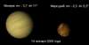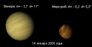 Сравнительные размеры Венеры и Меркурия в этот день можно посмотреть на прилагаемом рисунке. Вид планет прямой, как при наблюдении в бинокль. В телескоп изображение будет перевернутое. Во время соединения Венеры и Меркурия на небосводе, кроме этих планет будут находиться все остальные яркие планеты. Это значит, что соединение Венеры и Меркурия произойдет во время зимнего парада планет, который закончится после окончания видимости Венеры и Меркурия в эти дни. Это будет, образно говоря, последний хит зимнего парада планет 2005 года. Используйте этот шанс, пронаблюдав замечательное соединение Венеры и Меркурия. После соединения с Меркурием Венера будет находиться правее Меркурия. Это немаловажный факт для этих дней, т.к. все яркие планеты Солнечной системы будут находиться на небосводе одновременно и по своему истинному порядку от Солнца, т.е. Меркурий, Венера, Марс, Юпитер и Сатурн. Наблюдайте утреннее небо и изумляйтесь, какие замечательные зрелища преподносит нам Ее Величество Астрономия!