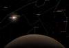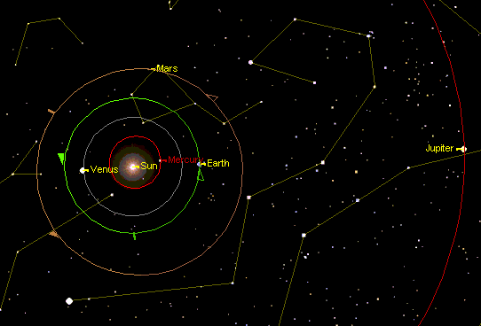 Интересно, а что в это время можно наблюдать с Юпитера? Перенесемся на Юпитер (см. рис. слева). Поскольку Земля находится в соединении с Солнцем (Юпитер в противостоянии) ее нельзя наблюдать. Это наглядно показывает рисунок (см. рис. выше) конфигурации планет Солнечной системы на момент противостояния Юпитера. Рядом с Землей находятся Венера и Меркурий, которые так же нельзя наблюдать с Юпитера, т.к. они находятся вблизи соединения с Солнцем. Марс виден в это время на расстоянии 15 градусов от Солнца и менее ярок, чем с Земли (+3,5m) . Он виден с Юпитера в виде половинки диска, однако видимый с Юпитера диаметр планеты в 2 секунды дуги не позволит воображаемым наблюдателям рассмотреть никаких деталей на диске. Уран и Нептун по блеску и видимому диаметру не изменились и остались почти такими же, как при наблюдении с Земли. Сатурн и Нептун находятся несколько в стороне от остальных планет. А вот как будет выглядеть Юпитер с его спутника Европы (см. рис. справа) 3 апреля в гринвичскую полночь. Видимый диаметр Юпитера на небосводе Европы составит 12 градусов, что в 24 раза больше видимого диаметра Луны на земном небе!