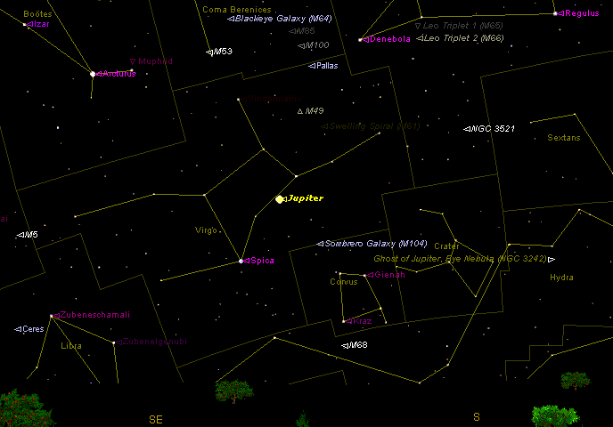 Кроме Юпитера на рисунке отмечены положения туманных (deep-sky) объектов. Такой же вид неба предстанет взору наблюдателя и для других городов на широте Москвы. Для остальных городов высота Юпитера над горизонтом будет выше, если наблюдатель находится южнее широты Москвы и ниже, если наблюдатель находится севернее широты Москвы. На момент противостояния Юпитер будет находиться созвездии Девы, как «лишняя» яркая звезда с блеском –2,5m. Диаметр планеты составит 44”. Планета в период противостояния движется попятно, описывая на небосводе петлю. Почти весь 2005 год Юпитер будет находиться в созвездии Девы, и только в конце ноября перейдет в созвездие Весов. Даже в малые телескопы, начиная от телескопов с диаметром объектива от 60 мм и выше, можно наблюдать полосы на диске Юпитера. Полноценные наблюдения Юпитера можно провести с телескопом от 100 мм в диаметре. На таком телескопе можно наблюдать детали на поверхности Юпитера, а так же знаменитое Красное пятно. И, конечно, противостояние самое лучшее время для наблюдений спутников Юпитера, для малых телескопов будут доступны 4 спутника: Ио, Европа, Ганимед и Каллисто.