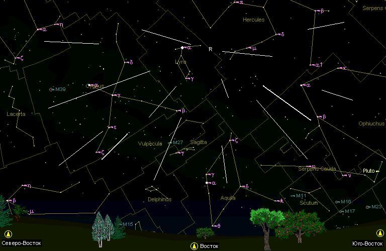 Этот рисунок отражает вид звездного неба с метеорами из созвездия Лиры около 2 часов ночи местного времени 22 апреля 2005 года. Буквой R обозначен радиант потока. Метеоры вылетают из этого радианта, который легко определить, нанеся на карту несколько метеоров из потока. Конечно, одновременно подобная картина будет наблюдаться при обильном метеорном потоке. При наблюдении обычного максимума можно заметить лишь один метеор за пару минут (в лучшем случае за минуту или даже менее), но при нанесении метеоров на карту будет наблюдаться подобная картина. Место пересечения продолжения путей метеоров от конца к началу и будет точкой этого радианта.