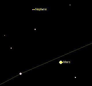 На рисунке слева дан крупномасштабный вид участка неба с Марсом и Нептуном (на указанное время) для точного определения положения Нептуна. Элонгация от Солнца на момент соединения составит 66 градусов, что позволит успешно провести наблюдения этого явления. Из-за малых видимых диаметров Марса и Нептуна различить их диски можно будет при наблюдениях с 60-кратным увеличением для Марса и 100-кратным увеличением для Нептуна. Блеск Марса на момент соединения составит +0,9m, а диаметр – всего 6,2 угловых секунд. Нептун, конечно же, уступает Марсу в блеске (+8,0m), а по видимому диаметру почти в 3 раза меньше Марса (d=2,2”). Расстояние в этот день составит: до Марса - 1,5125 а.е, а до Нептуна – 30,4578 а.е. (1 астрономическая единица –а.е.- равна 150 млн. км.).