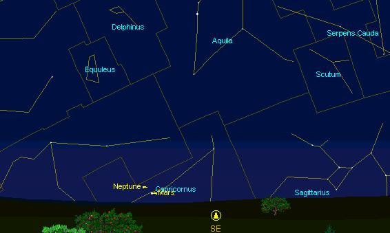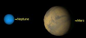 Сравнительные видимые размеры Марса и Нептуна в этот день можно посмотреть на прилагаемом рисунке опять же слева. Вид планет прямой, как при наблюдении в бинокль. В телескоп изображение будет перевернутое.