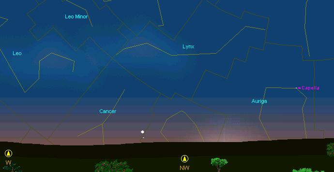 На следующем рисунке слева дан крупномасштабный вид участка неба с планетами для точного определения их положений относительно яркой Венеры. Показаны видимые диаметры планет в масштабе и угловые расстояния между ними в минутах. Вид планет прямой, как при наблюдении в бинокль. В телескоп изображение будет перевернутое. Такое расположение планет будет в 23 часа 00 минут по московскому летнему времени 26 июня 2005 года. Элонгация от Солнца на момент соединения составит 23 градуса, но низкое положение планет над горизонтом позволит успешно провести наблюдения этого явления только в сильный бинокль или телескоп. Видимые диаметры Меркурия, Венеры и Сатурна можно будет различить уже при 40х, но волнение атмосферы у горизонта будет замывать изображения планет. Тем не менее, как было сказано, все три планеты можно попытаться пронаблюдать на дневном небе 26 и 27 июня.