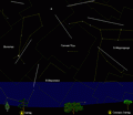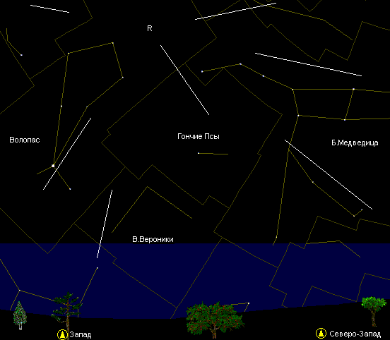 На рисунке показан вид неба с указанием радианта потока 24 июня в 2 часа 20 минут в Москве или за 2,5 часа до восхода Солнца в других населенных пунктах на широте Москвы. Радиант потока обозначен буквой R. Метеоры вылетают из этого радианта, который легко определить, нанеся на карту несколько метеоров из потока. Конечно, одновременно подобная картина будет наблюдаться при обильном метеорном потоке. При наблюдении обычного максимума можно заметить лишь один метеор за пару минут (в лучшем случае за минуту или даже менее), но при нанесении метеоров на карту будет наблюдаться подобная картина. Место пересечения продолжения путей метеоров от конца к началу и будет точкой этого радианта.