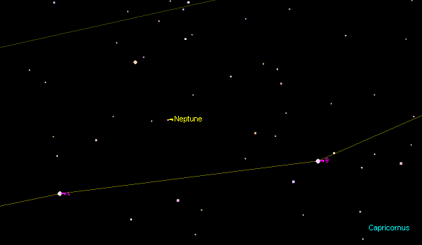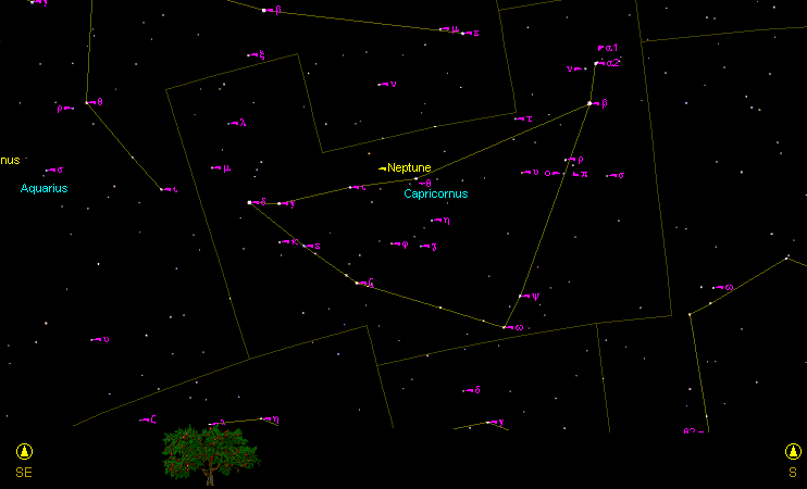 На прилагаемом рисунке показан вид неба с Нептуном в полночь 8 августа 2005 года для городов на широте Москвы. Для остальных городов высота Нептуна над горизонтом будет выше, если наблюдатель находится южнее широты Москвы и ниже, если наблюдатель находится севернее широты Москвы. Его блеск составит + 7,8m, а диаметр – около 2,3”. Сейчас планета движется попятно, описывая закономерную петлю в движении относительно Земли, и весь наблюдательный сезон 2005 года будет находиться в созвездии Козерога. Полноценные наблюдения Нептуна можно провести с телескопом от 150 мм в диаметре. На таком телескопе можно хорошо рассмотреть диск Нептуна с увеличением от 100-120 крат, но какие либо детали не удастся заметить. Нептун можно разглядеть и в бинокль, не смотря на то, что расстояние до Нептуна очень велико. Даже свет пробегает путь от Земли до Нептуна за время около 4 часов. Для того чтобы обнаружить Нептун, необходимо иметь полевой бинокль или телескоп и звездную карту. Карта звездного неба на период видимости в 2005 году. Звезды даны до 10m.