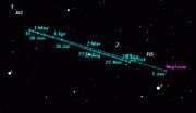 Для облегчения поисков предлагаем вашему вниманию карту звездного неба на период видимости в 2005 году. Звезды даны до 9m.