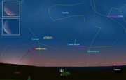 Очередная утренняя (западная) элонгация Меркурия произойдет в созвездии Рака. 24 августа 2005 года в 2 часа 08 минут по московскому летнему времени планета отделится от Солнца на небесной сфере на расстояние 18°24’. Звездная величина планеты на этот момент будет равняться 0, диаметр составит 7,4”, а фаза увеличится до 0,43. В 7 градусах западнее Меркурия будет находиться Сатурн и украсит утреннее небо вместе с Меркурием. Сатурн будет иметь блеск +0,3m, а диаметр – 17 угловых секунд. Продолжительность видимости Меркурия в период элонгации составить около часа в средних широтах страны, благодаря своему большому склонению относительно Солнца. На приводимом рисунке показан вид неба в период утренней элонгации Меркурия 24 августа за полчаса до восхода Солнца. На врезке вверху изображен Меркурий. Ниже показана Луна в той же фазе 27 августа.