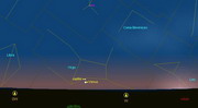 Соединения планет – частое явление. Ежегодно происходит более десятка соединений планет. В основном соединяются внутренние планеты (Меркурий и Венера) между собой и внутренние планеты с внешними планетами. Соединения Меркурия и Венеры в 2005 году происходили 4 раза. В остальных соединениях планет Меркурий или Венера соединялись с внешними планетами. Соединения Венеры и Юпитера обычно происходят раз в год. В этом году такое соединение приходится на начало осени. Схематическое изображение положения планет относительно друг друга показано на рисунке слева на вечернее время 1 сентября 2005 года. В светосильный инструмент также может быть найдена на небосводе Спика. Во врезке на этом рисунке показан вид планет в телескоп с хорошим увеличением. Конечно, в реальных условиях диски планет будут более размыты волнениями атмосферы у горизонта. К тому же, вблизи горизонта все светила окрашиваются в цвета радуги из-за преломления света в слоях атмосферы. Тем не менее, этот «вредный фактор» может принести чисто эстетическое наслаждение красотой заходящей Венеры и Юпитера. Если Вам удастся запечатлеть заход Венеры и Юпитера на фотопленку (в телескоп и с хорошим увеличением), то эти снимки могут занять достойное место в шедеврах астрофотографии. Присылайте свои снимки!