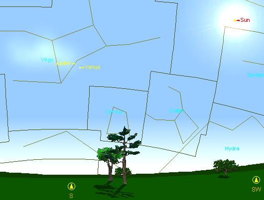 На рисунке слева показано положение этих планет на небосводе (общий вид) 1 сентября через полчаса после захода Солнца. Очевидно, что времени для наблюдений этого явления невооруженным глазом будет очень мало. Чтобы без спешки пронаблюдать сближение этих планет, такие наблюдения можно провести и днем. Для этого нужно знать горизонтальные координаты этих светил в момент времени наблюдений. Такие координаты легко можно вычислить при помощи персонального компьютера. Для тех, кто не имеет возможности получить такие координаты, приводится вид неба (см. рис. справа) в 16 часов 00 минут по московскому летнему времени 1 сентября 2005 года. Венера и Юпитер в это время находятся точно на юге на высоте 27 градусов над горизонтом на широте Москвы. Для любителей астрономии, живущих южнее, нужно прибавлять по 1 градусу высоты на каждый градус южнее Москвы, а для любителей, живущих севернее Москвы, наоборот убавлять. Пользуясь этим рисунком в указанное время можно легко найти Венеру в бинокль, наведя его точно на юг и подняв на угол 27 градусов. Правее и выше Венеры можно будет разглядеть Юпитер в виде слабого туманного диска. У тех, кто еще не наблюдал Юпитер днем, будет прекрасная возможность провести такие наблюдения.