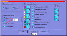 В меню настройки активизируем кнопку "Метки объектов" открывая окно под названием “Опции” (рис-в) устанавливаем флажок или в поле "имя" или в поле "Зв.величина" рис–в(1). Распечатывание карт окрестностей принтером происходит через меню “Файл” щелчком мыши по кнопке “Печать”