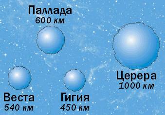 Поскольку малые планеты даже в телескоп видны как светящиеся точки, похожие на звезды, их называют еще астероидами (звездоподобными). Первая из них была открыта в 1801 г. и получила имя, взятое из древней мифологии, - Церера. Она оказалась самой большой - ее диаметр около 1000 км. Вскоре были обнаружены Паллада, Веста и Юнона. Эти и другие открытые за последующие полтора столетия малые планеты, в основном, обращаются между орбитами Марса и Юпитера, в так называемом поясе астероидов. Кроме Весты ни одна из них не видна невооруженным глазом. Считается, что общее число малых планет, размеры которых превышают 1 км, может достигать миллиона. По массе астероиды невелики. Даже общая масса всех астероидов составляет не более 1/1000 массы Земли.